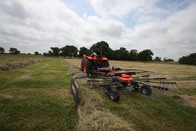 The Kubota RA1035 and RA1042T single rotary rakes are designed for low power requirements, while still delivering considerable working width of 9’2” & 11'6" with swath and 10’2” on the RA1042T & 13’9” including swath, respectively. With a pivoting three point linkage machine (RA1035) as well as a trailed version (RA1042T), there is a model to meet any field or crop needs.